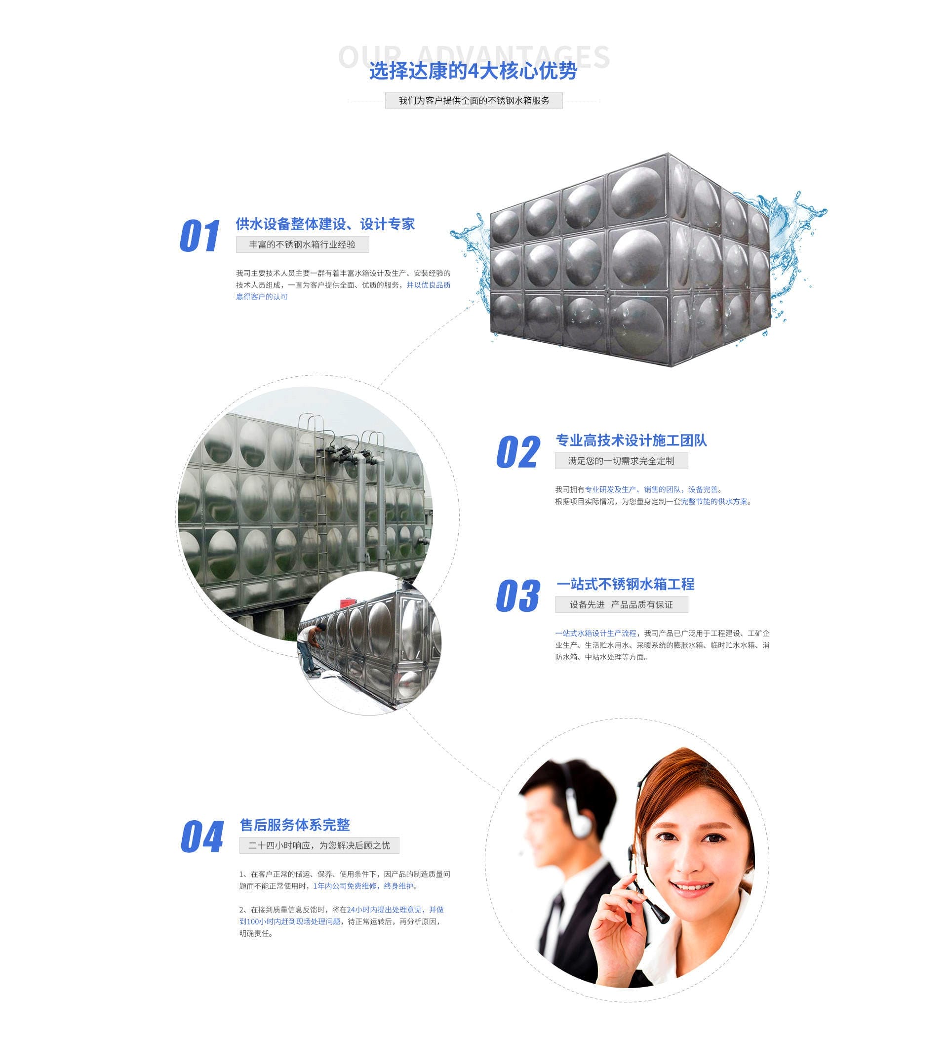 苏州达康供水设备有限公司是一家专业研发、生产制造、销售于一体的不锈钢水箱厂家。我厂是苏州专业从事不锈钢方型水箱、玻璃钢水箱、不锈钢保温水箱及相关产品的单位。我厂拥有专业的技术力量和生产设备,专业营销人员的竭诚服务,精选高性价比比的产品,为您提供全方位的服务。我厂主要产品有:不锈钢水箱、无负压供水设备、箱泵… 【了解更多】